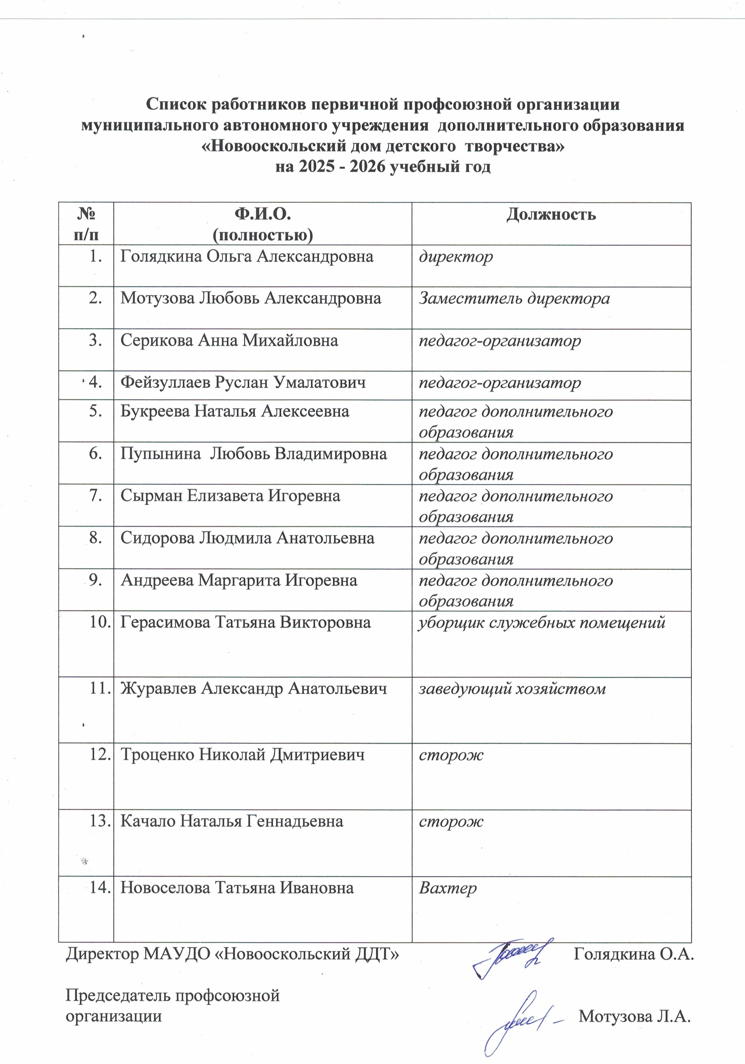 Список работников первичной профсоюзной организации МАУДО "Новооскольский ДДТ"